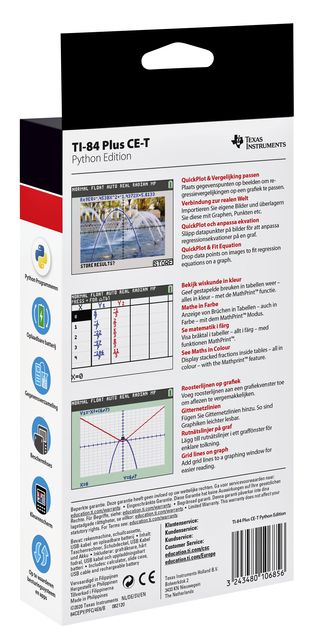 * De krachtige grafische, numerieke rekenmachine voor wiskunde en natuurwetenschappen in het voortgezet onderwijs. * Voorzien van examenstand dat verplicht is voor centrale eindexamens vanaf HAVO 2018 en VWO 2019. * Deze Python Edition is voorzien van een speciale Python App waardoor leerlingen in Python kunnen programmeren. * De TI-84 Plus CE-T met backlight kleurenscherm, een verbeterde interface en oplaadbare batterij. * USB-computerkabel voor het overzenden van bestanden en het opladen van de batterij inbegrepen. * Schermgrootte 320x240 pixels (2.8-inch diagonaal). * Schermresolutie 140 DPI, 16-bits kleuren. * 3,5MB Flash ROM-geheugen voor het opslaan van gegevens en applicaties (apps). * 21KB RAM-geheugen. * Download de TI Connect software en download gratis apps met behulp van de meegeleverde USB-kabel (unit naar computer). * Ondersteunt de programmeertalen TI Basic en ASM.