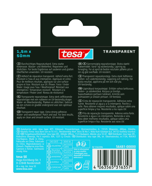 * tesa® Ultra Power Under Water Transparent biedt betrouwbare bescherming voor alle reparaties buiten. * Kleine defecten kunnen snel en eenvoudig worden gerepareerd met deze afdichtingstape – of het nu rond het huis, in de tuin of tijdens outdooractiviteiten op vakantie is. * De hoge kleefkracht van de outdoortape is niet alleen betrouwbaar op droge oppervlakken, maar ook extreem weerbestendig, waardoor de tape geschikt is voor gebruik onder water. * Een scheur in het zwembad, een gebroken peddel of een lekkage in de afvoer: plotselinge problemen in het dagelijks leven, in de keuken of in de badkamer, of zelfs tijdens een buitenavontuur vereisen een snelle en vooral betrouwbare oplossing. * Het tesa Ultra Power Under Water reparatietape maakt reparaties mogelijk, niet alleen op droge oppervlakken, maar ook bij natte omstandigheden of zelfs onder water, en biedt daarbij een bijzonder sterke hechting. * Het veelzijdige afdichtband past zich flexibel aan verschillende vormen en objecten aan en kan worden gebruikt voor het repareren van gaten, scheuren en barsten, evenals voor het afdichten van lekkende dakgoten, afvoeren of andere lekken. * Dankzij de transparantie past het afdichtband zich aan elke omgeving aan en is het bijna onzichtbaar. * Door de hoge UV- en temperatuurweerstand kan het zelfs in extreme weersomstandigheden en bij temperaturen tussen -30 °C en +60 °C worden gebruikt. * Het tesa Ultra Power Under Water reparatietape is niet alleen een handige metgezel voor buitenactiviteiten, maar mag ook in geen enkel huishouden ontbreken. * Tesa - meer dan alleen een plakband.