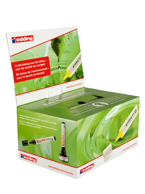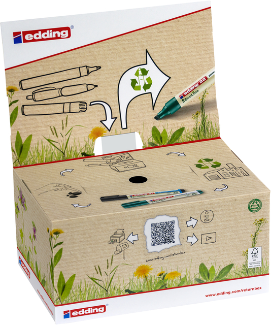 * Wat moeten we doen met markers en pennen die zeker niet meer te gebruiken zijn? * Het is zonde om ze zomaar weg te gooien, want ze bevatten waardevolle materialen die we kunnen recyclen. * Daar heeft edding nu een oplossing voor: de edding retourbox. * Deze handzame dozen leveren we aan trade partners en (grote) ondernemingen. * De box komt op een centrale plek in de organisatie te staan, zodat iedereen hier lege en afgekauwde markers en pennen in kan doen. * Ongeacht het merk. * In samenwerking met een gespecialiseerd bedrijf voor kunststofrecycling hebben we een recyclingkringloop ontwikkeld waarmee we meer dan 70% van het teruggewonnen plastic kunnen gebruiken voor de productie van nieuwe edding-producten, zoals de EcoLine serie. * Doordat we oude spullen hergebruiken, besparen we flink op de productie van nieuwe materialen. * Dat scheelt al snel een uitstoot van 83 ton CO2 per jaar! * Dezelfde hoeveelheid die een auto produceert als hij tien keer rond de aarde rijdt. * Zit de groene doos vol markers en pennen, dan krijg je van ons een lege nieuwe terug. * De weggegooide markers gebruiken we voor onze EcoLine producten die we zo klimaatneutraal te produceren. * Een beter milieu begint bij jezelf. * Onder andere met de edding retourbox! * Bestaat uit 45% gerecycled materiaal en is 100% recyclebaar. * De afmeting van de edding retourbox is 588x320x14mm en het gewicht is ca 392 gram.