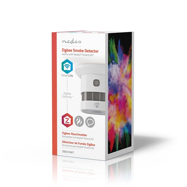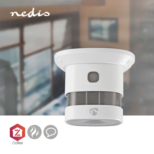 * Deze compacte Nedis Zigbee rookdetector slaat alarm bij rookontwikkeling, met een luid alarm voor degenen in de buurt en een melding naar je telefoon, waar je ook bent. * Met zijn compacte afmetingen van 43 x 43 mm (excl. basis), is hij 75% kleiner dan de meeste andere detectors en kan hij onopvallend worden geplaatst. De melder bevat voldoende ruimte voor een krachtige sensor met een levensduur van 10 jaar en een alarm dat een waarschuwing van 85 decibel afgeeft in het vroegste stadium van een brand. * De rookdetector is heel eenvoudig te installeren, met de meegeleverde 3M-tape of de schroeven. De meegeleverde lithiumbatterij werkt 5 jaar voordat hij toe is aan vervanging, waarvoor je ook een melding via je telefoon ontvangt. * Installeer deze rookdetector in de gratis Nedis SmartLife-app door hem draadloos op je Zigbee Gateway (WIFIZBxxx) aan te sluiten. Hij kan eenvoudig met andere SmartLife-producten worden gecombineerd voor extra veiligheidsfuncties. Denk hierbij bv. aan inschakelen van slimme gloeilampen wanneer er rook wordt gedetecteerd, om je veilig naar de uitgang te loodsen. * App beschikbaar voor IOS, Android™ * Batterij CR123A inbegrepen