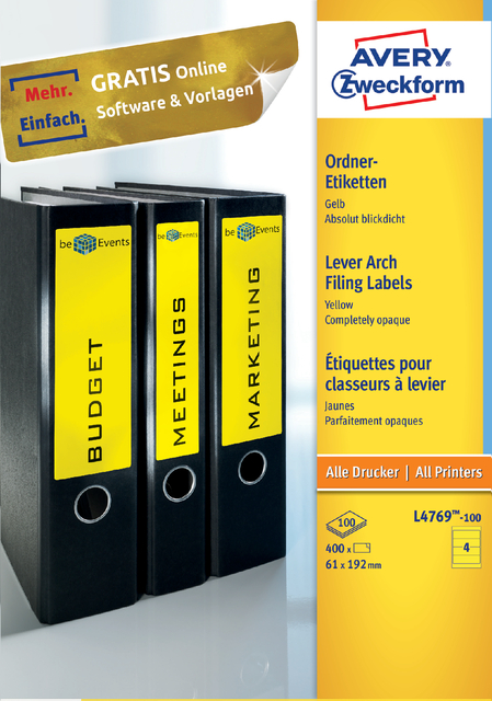 * Zelfklevende ordnerrugetiketten. * Eenvoudig bedrukbaar. * Op A4 vel, in diverse kleuren. * Avery ordneretiketten schijnen niet door (BlockOUT). * Alle witte etiketten zijn FSC-gecertificeerd. * Het etiket is blanco, waardoor u ze volledig kan personaliseren. * Geschikt voor inktjet, laserprinters en kopieerapparaten. * Gratis online templates en ontwerpsoftware beschikbaar op http://www.avery.eu.