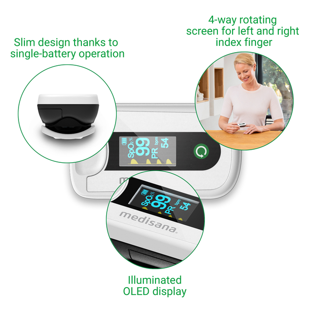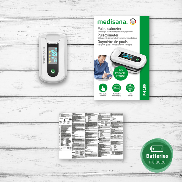 * Met de PM 180 pulsoximeter van medisana kunnen de zuurstofverzadiging in het bloed en de hartslag (polsslag) snel en nauwkeurig worden gemeten. Dankzij de eenvoudige bediening, het lage gewicht en het slanke ontwerp is het een handige manier om de belangrijkste vitale functies altijd in de gaten te houden - ideaal voor regelmatige gezondheidscontroles thuis of onderweg.