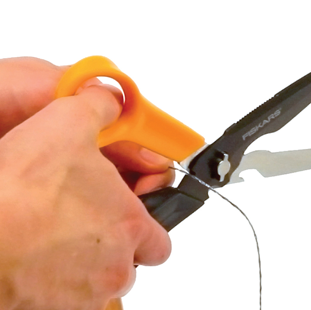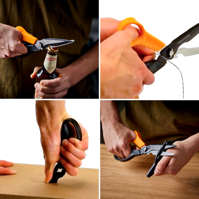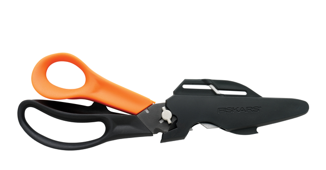 * De Fiskars Cuts & More schaar is de ultieme universele rechtshandige schaar met ergonomische handgrepen die niet mag ontbreken in de keuken, tuin of garage: je kunt er niet alleen mee knippen, maar ook draad mee snijden, een fles mee openen, of als mes gebruiken als je de lemmeten losmaakt. * Functies: Mes, Stripper voor elektriciteitskabel, Flesopener, Scharenslijper, Plakbandsnijder, Draadsnijder. * Het titanium gecoate mes is 3x harder dan staal. * Vaatwasmachine bestendig.