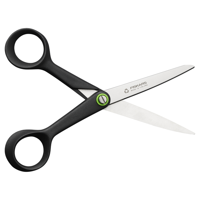 * De Fiskars Functional Form ReNew universele schaar combineert duurzaamheid met uitzonderlijke knipprestaties en comfort. * Gemaakt van minimaal 70% gerecycled materiaal, is deze schaar het perfecte voorbeeld van milieuvriendelijk vakmanschap, geproduceerd in onze milieugecertificeerde fabriek in Finland. * Elke schaar wordt met de hand afgewerkt en uitvoerig getest voor superieure kwaliteit. * De grote universele schaar, met een lengte van 21 cm, is veelzijdig inzetbaar voor diverse toepassingen in en om het huis. * De duurzame roestvrijstalen bladen, vervaardigd van ongeveer 80% gerecycled materiaal, zijn precisiegeslepen voor langdurige scherpte en betrouwbare prestaties. * Het ergonomische handvat, gemaakt van een mix van gerecycled plastic (80%) en glasvezel (20%), zorgt voor optimaal comfort en controle. * Daarnaast is de schaar vaatwasbestendig en verpakt in een zero-plastic verpakking die eenvoudig te recyclen is. * Speciaal ontworpen voor rechtshandigen, biedt de Fiskars ReNew universele schaar een duurzame en praktische oplossing voor elke knipklus, zonder in te boeten op kwaliteit of gebruiksgemak.