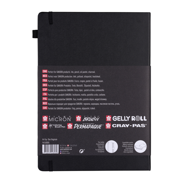* In zwart gebonden Sakura schetsboek met crème witte pagina's. * Een ideaal schetsboek voor het tekenen op locatie en het oefenen van technieken (inkt/potlood/oliepastel/houtskool). * Natuurlijk ook te gebruiken als notitieboek. * Elk Sakura schetsboek heeft een handige penhouder aan de zijkant, bijvoorbeeld voor je Pigma Micron fineliner, Gelly Roll gelpen of Koi Brush Pen! * Daarnaast zit er achterin het schetsboek een enveloppe waar je kunstwerken in kan opbergen! * Kenmerken: • 140 g/m² • A4 (21x29,7 cm) • 80 pagina's • Geschikt voor verschillende technieken * Sakura Japans vernuft op teken-, kleur- en schrijfgebied sinds 1921. * Dat is Sakura. Als uitvinder van de gelpen, bedenker van ’s werelds eerste oliepastelkrijt en superieure Pigma pigmentinkt heeft Sakura al heel wat vernieuwende teken- en schrijfproducten bedacht. * Sakura biedt een breed assortiment variërend van kleur- en tekenproducten op creatief gebied tot functionele schrijfmaterialen voor thuis, kantoor en industrie.