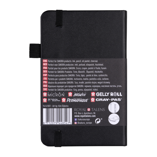 * In dit schetsboek/ notitieboek met 80 zwarte vellen 140 g/m2 zuurvrij papier, bewaar je al je creaties in inkt, potlood, oliepastels of houtskool. * Het hardcover boek wordt geleverd met een penhouder die perfect past bij pennen zoals de Pigma Micron en Sakura Gelly Roll. * Achter in het boek is een uitbreidbare envelop opgenomen voor het opslaan van schetsen en notities. * Dankzij de elastische sluitband blijft het boek ook onderweg gesloten en compact. * De exclusief geïllustreerde hoes kan worden gebruikt als bladwijzer. * Kunst door: Kim Dijkstra. * Afmeting: 9x14cm.