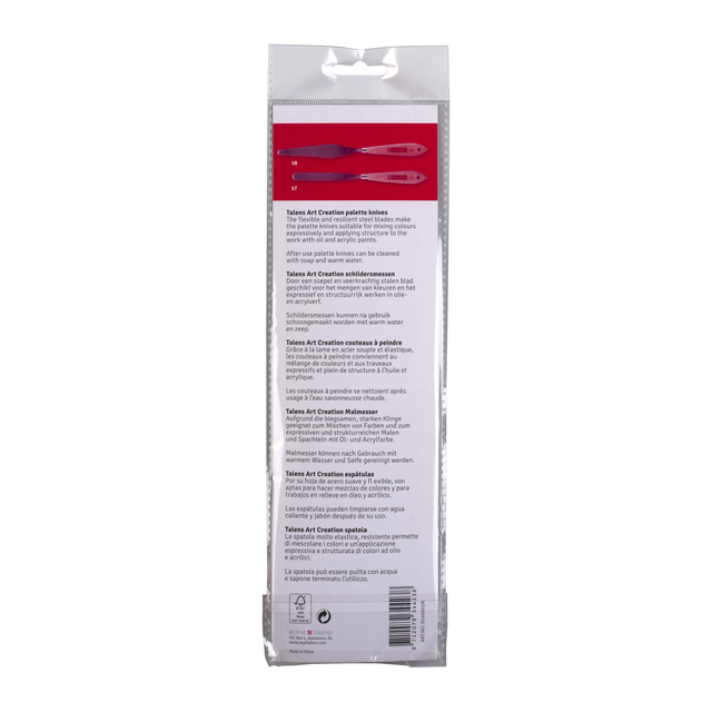 * Set van 2 metalen schildersmessen. * Door de langwerpige rechte vorm zeer geschikt voor het bereiden en mengen van kleuren. * Tevens voor het expressief en structuurrijk werken in olie en acryl.