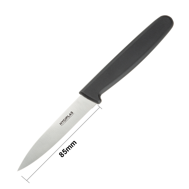 * Met dit rechte schilmesje van Hygiplas snijdt u moeiteloos allerlei producten. Het lemmet heeft een lengte van 7,5cm, ideaal voor fruit, groente, kruiden of andere garneringen. Het scherpe, stevige lemmet levert telkens weer professionele schil- en snijresultaten. * Het ergonomische zwarte heft ligt prettig in de hand en het lemmet is gemaakt van roestvrij staal.