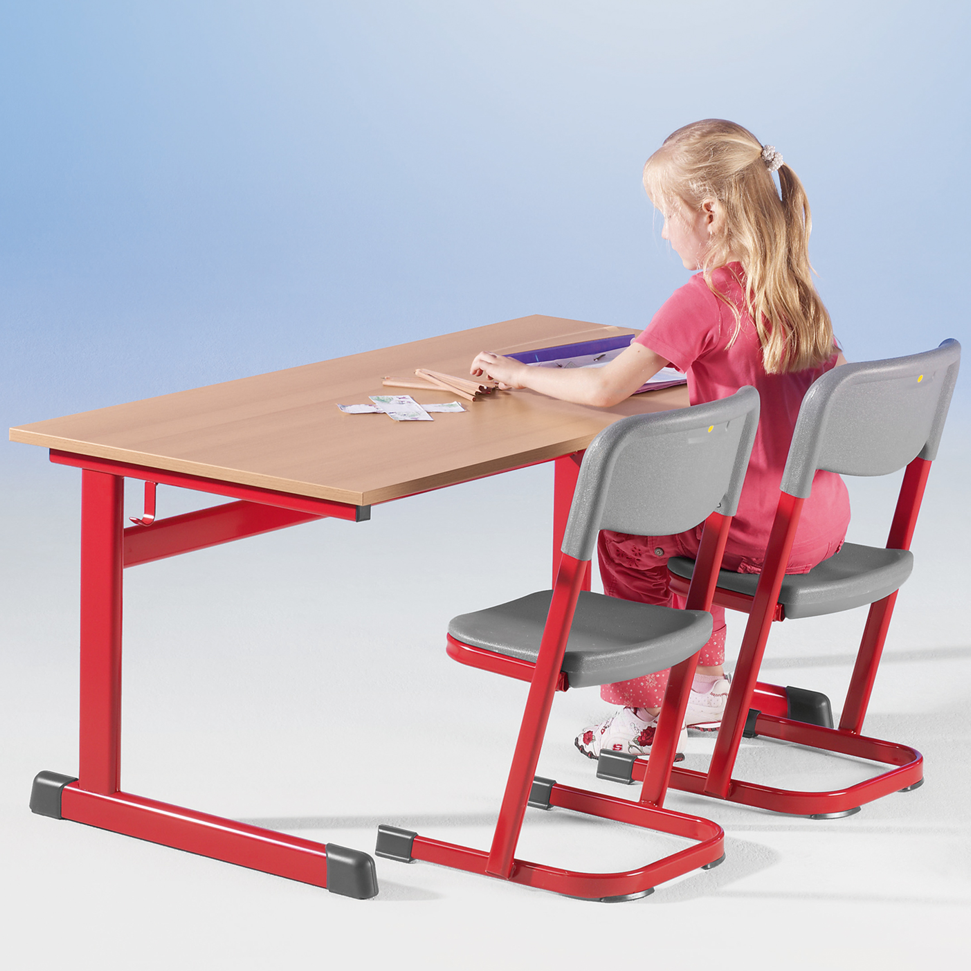 De MST 30 KG is gemaakt van een extreem kras- en slijtvast speciaal materiaal. Juist daarom is hij voorbereid op alle eisen van het harde dagelijkse schoolleven. De luchtkussenvering van de ergonomische schoolstoel uit de serie ST 40 KG zorgt voor een hoog zitcomfort. De leerlingstoel is schoon dankzij de kunststof zitting en rugleuning. De schoolstoel ST 40 KG wordt ondersteund door een stabiel U-sledeframe van ovale precisiebuis in het formaat 40x20 mm. De uiteinden van de buis van de leerlingstoel zijn afgesloten met recyclebare, afgeronde ABS plastic doppen. De voetbuis is voorzien van een opstapbescherming 70x25 mm. Alle stalen onderdelen zijn ook verkrijgbaar in verschillende RAL-kleuren. De MST 40 KG is eenvoudig op te zetten en stapelbaar. De zithoogte van de stoel is gebaseerd op DIN ISO 5970.
