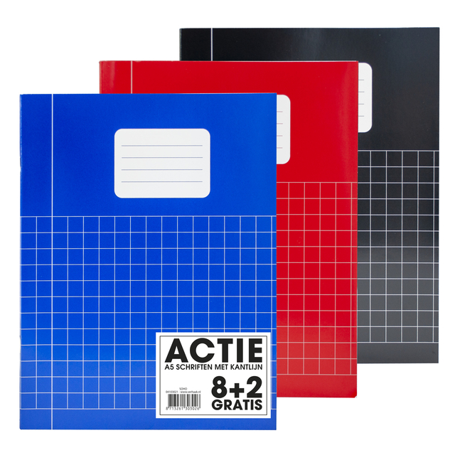 * Een set van 10 schriften in verschillende kleuren, zwart, rood en blauw. * Een A5 formaat, uitermate geschikt voor het maken van aantekeningen of samenvattingen voor school of werk! * Voorzien van een kantlijn en 60gr wit 10x10mm ruitjes papier.