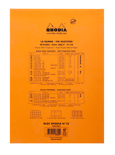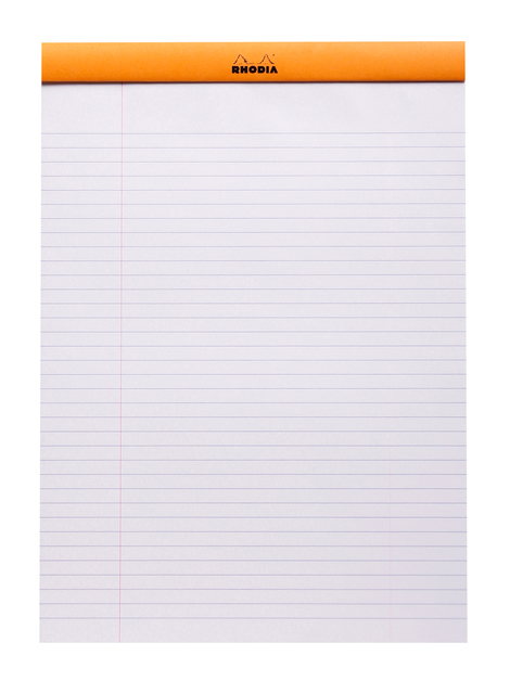 * Rhodia notitieblok N°18, 21x29,7 cm, 80 vel gelijnd papier met marge. Ultra-functioneel, het Rhodia notitieblok is "De" referentie voor geniete notitieblokken! 80 afscheurbare vellen met microperforatie. Stevige kartonnen basis zodat je zelfs zonder steun notities kunt maken. Clairefontaine 80gr fijn vellum papier, PEFC gecertificeerd.
