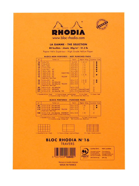 * Rhodia notitieblok N°16, 14,8x21 cm, 80 vel gelijnd papier met marge. Ultra-functioneel, het Rhodia notitieblok is "De" referentie voor geniete notitieblokken! 80 afscheurbare vellen met microperforatie. Stevige kartonnen basis zodat je zelfs zonder steun notities kunt maken. Clairefontaine 80 g fijn vellum papier, PEFC gecertificeerd.