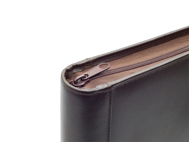Eigenschappen "Schrijfmap van der Spek A4 4-rings 25mm O-mechaniek + rits leer met nerf bruin"
