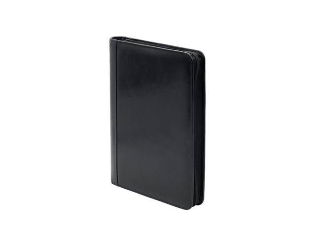 * Royale buffel lederen A4 ritsmap met 25mm mechaniek. * Inclusief A4 schrijfblok met 50vel 80gr wit schrijfpapier. * Veel opbergruimte. * Met een groot en een klein insteekvak en breed ritsvak. * 6 visitekaartvakjes en venstervak. * 2 royale peninsteken (pen niet inbegrepen). * Schrijfblok insteek met daaronder een groot insteekvak. * Formaat 350mmx270mmx45mm.