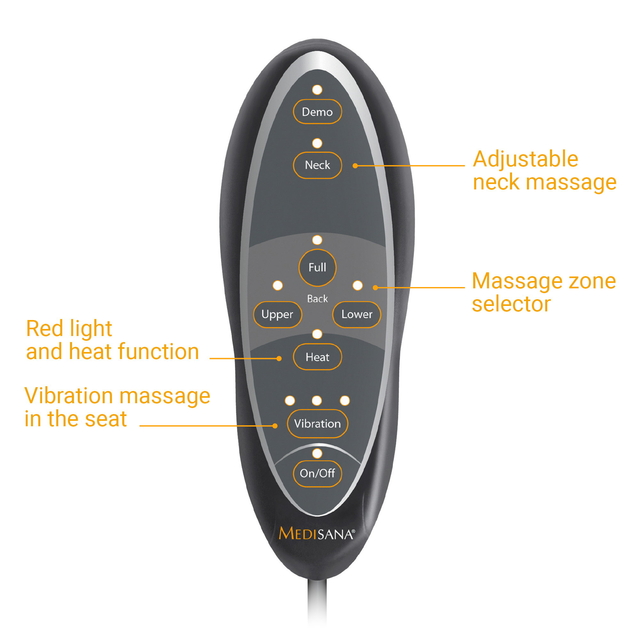 * Kalmerende shiatsu-massage voor nek en rug. Shiatsu, een vorm van vingerdrukmassage, is een van de belangrijkste massagetechnieken zoals manuele lymfedrainage en reflexologie. Deze vorm van lichaamstherapie vindt zijn oorsprong in de traditionele Chinese massage. Zachte aanrakingen en kalmerende druk worden gebruikt om vitale energie op te wekken en te laten stromen. Het doel van deze massage is om spanningen te verlichten en lichaam en geest te harmoniseren door de stroom van vitale energie te optimaliseren. * De unieke combinatie van intensieve shiatsu, spotmassage en milde warmte in de Medisana MCN shiatsu massage stoelhoes maakt de MCN massagehoes van Medisana tot een effectieve en ontspannende behandeling. De praktische bedrade afstandsbediening zorgt voor eenvoudige bediening en gebruiksgemak. * De MCN massagestoelhoes is uitgerust met 2 driedimensionaal roterende dubbele massagekoppen en bereikt zo een 3D-effect. De massagekoppen bewegen niet alleen van boven naar beneden, maar ook van links naar rechts en van achteren naar voren. Bovendien biedt de bekleding massage in high definition en belooft daarom een nog intensievere massage-ervaring.