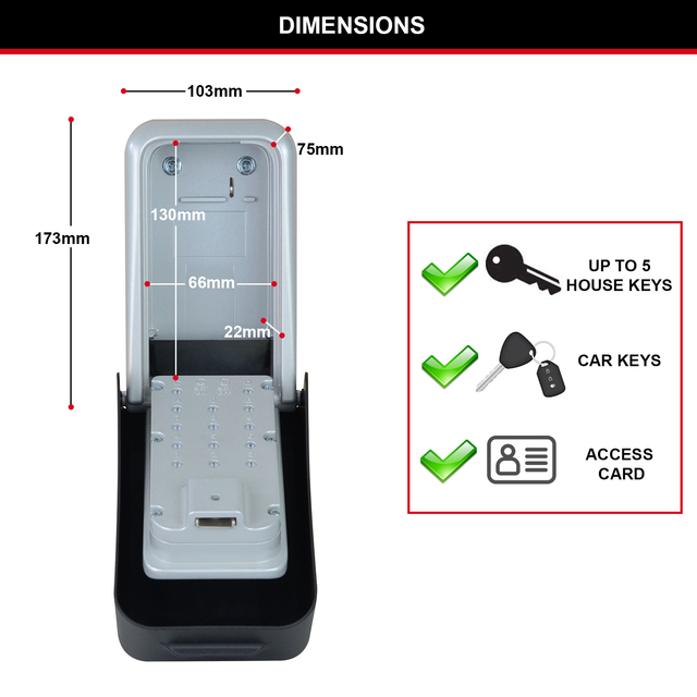 * Veiligheidskastje voor sleutels. * XL-formaat. * Gecertifeerd CNPP (Frankrijk), Sold Secure en Secured By Design (VK). * Versterkte zinken constructie. * Instelbare combinatie. * Programmeerbaar combinatieslot met drukknoppen. * Voor alle soorten sleutels & toegangskaarten. * Beschermingsomslag voor weerstand tegen slecht weer en meer discretie. * Inclusief montagekit. * Perfect voor Airbnb, B&B, Thuiszorg en alle andere vertrouwde omgevingen. * Afmetingen buitenkant (hxbxd): 173x103x75mm. * Afmetingen binnenkant (hxbxd) 130x66x22mm. * Kleur grijs en zwart.