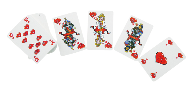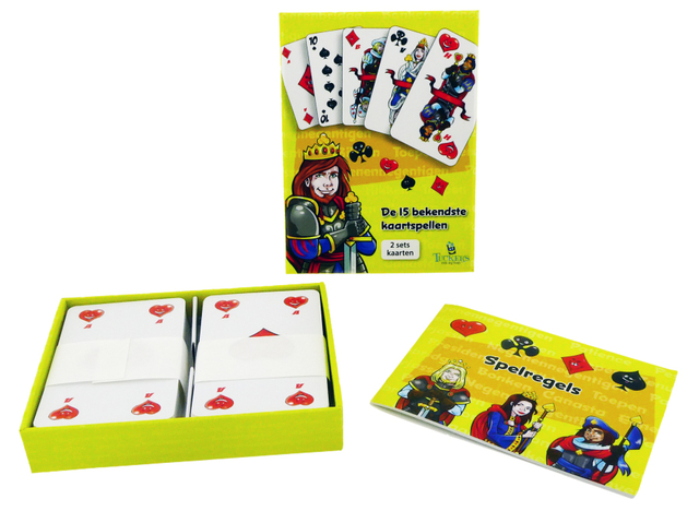 Dubbeldeks kaartspel met vrolijke illustraties en een spelregelboekje met de spelregels voor de 15 meest bekende kaartspellen zoals Pesten, Jokeren, Ezelen, Toepen, en Hartenjagen.