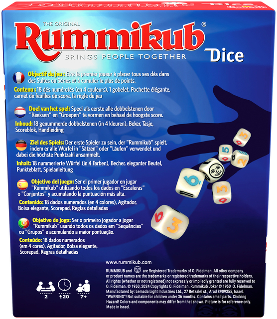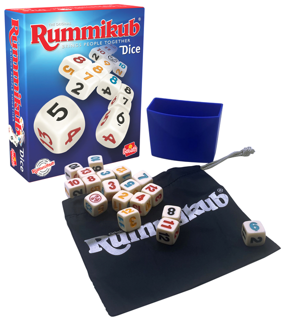 Ontdek "Rummikub Dice" - de perfecte mix van het klassieke Rummikub en dobbelspel-plezier! Rummikub Dice is snel, eenvoudig en biedt speelplezier voor jong en oud. Gooi de dobbelstenen om de beurt met de beker, vorm groepjes of reeksen, en wie als eerste al zijn dobbelstenen wegwerpt wint! Om te beginnen schrijf je alle namen om het scoreblok. Aan het begin van de ronde pakt de speler 9 dobbelstenen uit het zakje en stopt ze in de beker en gooit de dobbelstenen op tafel. Zodra er een set gegooid is dient deze op tafel geplaatst te worden. Wanneer er geen set is gegooid moet er gekeken worden of de dobbelstenen bij een reeks gelegde sets aangelegd kan worden. Wanneer een speler geen dobbelstenen aan kan leggen of reeksen kan vormen is de volgende speler aan de beurt. De ronde is voorbij zodra een speler alle dobbelstenen heeft opgelegd. Of wanneer een speler 3 rondes achter elkaar niet heeft kunnen aanleggen. Vanaf de tweede beurt in een ronde, mag een speler kiezen of hij een deel van de dobbelstenen wil gooien, of dat ze allemaal opnieuw gegooid worden. De speler die als eerste alle dobbelstenen heeft uitgespeeld wint het puntenaantal gelijk aan alle overgebleven dobbelstenen van de tegenstanders. De speler die aan het einde van 6 rondes de meeste punten heeft wint het spel.