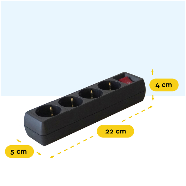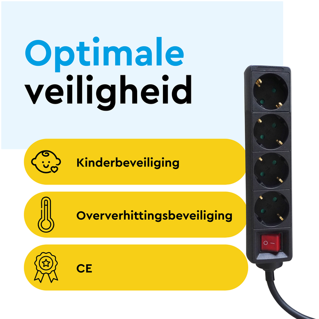 De stekkerdoos met schakelaar voldoet aan alle veiligheidseisen die betrekking hebben op dit product. Hij is voorzien van een ROHS, TUV GS en CE certificaat. * De contactpunten zijn voorzien van kinderbeveiliging. Door het gepatenteerde systeem is het niet mogelijk om voorwerpen in de stopcontacten te steken. * Overbelasting van een stekkerdoos kan leiden tot oververhitting en zelfs brandgevaar. Daarom is het cruciaal om te weten wat het maximale vermogen is dat de stekkerdoos aankan en deze limiet niet te overschrijden. * De zekering of overspanningsbeveiliging die de aangesloten apparaten beschermt tegen piekspanningen en kortsluitingen. * Bovendien is het belangrijk om stekkerdozen regelmatig te controleren op tekenen van slijtage, beschadiging of loszittende onderdelen. * Specificaties: * Capaciteit: 4 stekkers * Voeding: Netstroom