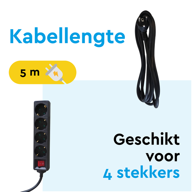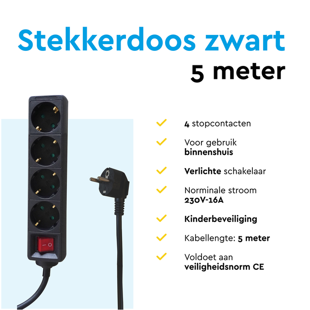 De stekkerdoos met schakelaar voldoet aan alle veiligheidseisen die betrekking hebben op dit product. Hij is voorzien van een ROHS, TUV GS en CE certificaat. * De contactpunten zijn voorzien van kinderbeveiliging. Door het gepatenteerde systeem is het niet mogelijk om voorwerpen in de stopcontacten te steken. * Overbelasting van een stekkerdoos kan leiden tot oververhitting en zelfs brandgevaar. Daarom is het cruciaal om te weten wat het maximale vermogen is dat de stekkerdoos aankan en deze limiet niet te overschrijden. * De zekering of overspanningsbeveiliging die de aangesloten apparaten beschermt tegen piekspanningen en kortsluitingen. * Bovendien is het belangrijk om stekkerdozen regelmatig te controleren op tekenen van slijtage, beschadiging of loszittende onderdelen. * Specificaties: * Capaciteit: 5 stekkers * Voeding: Netstroom