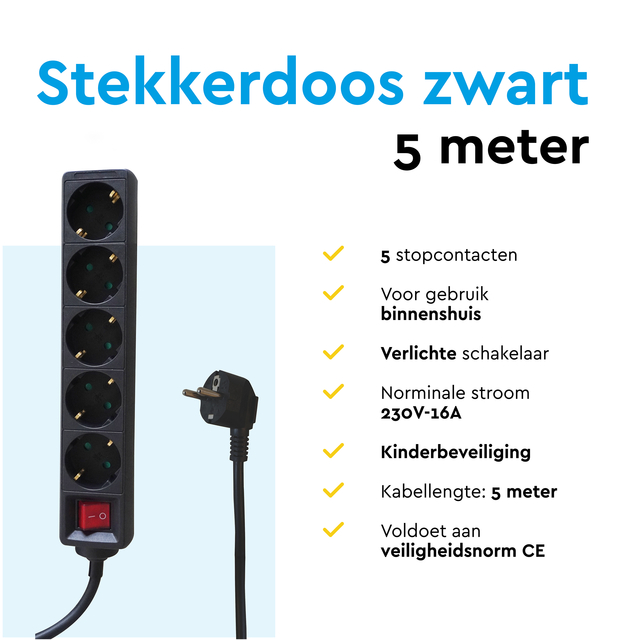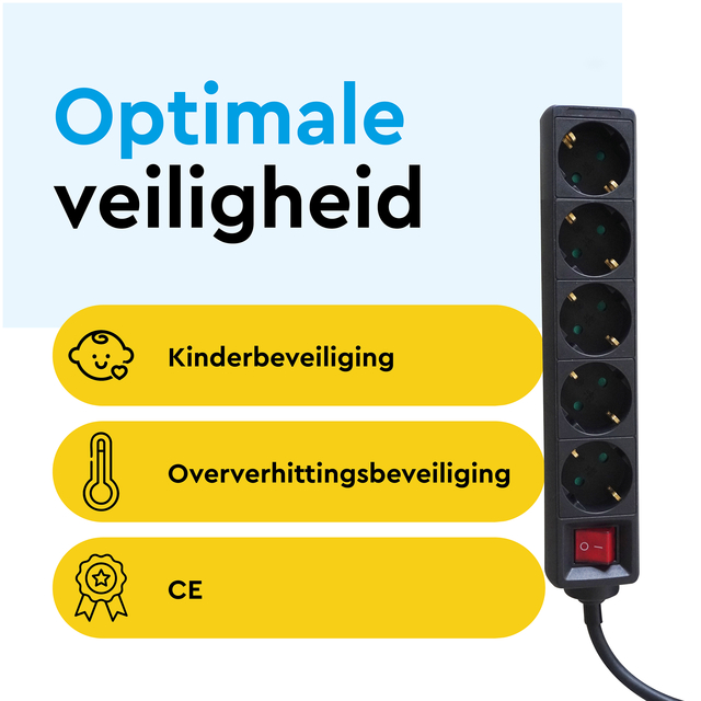 De stekkerdoos met schakelaar voldoet aan alle veiligheidseisen die betrekking hebben op dit product. Hij is voorzien van een ROHS, TUV GS en CE certificaat. * De contactpunten zijn voorzien van kinderbeveiliging. Door het gepatenteerde systeem is het niet mogelijk om voorwerpen in de stopcontacten te steken. * Overbelasting van een stekkerdoos kan leiden tot oververhitting en zelfs brandgevaar. Daarom is het cruciaal om te weten wat het maximale vermogen is dat de stekkerdoos aankan en deze limiet niet te overschrijden. * De zekering of overspanningsbeveiliging die de aangesloten apparaten beschermt tegen piekspanningen en kortsluitingen. * Bovendien is het belangrijk om stekkerdozen regelmatig te controleren op tekenen van slijtage, beschadiging of loszittende onderdelen. * Specificaties: * Capaciteit: 5 stekkers * Voeding: Netstroom