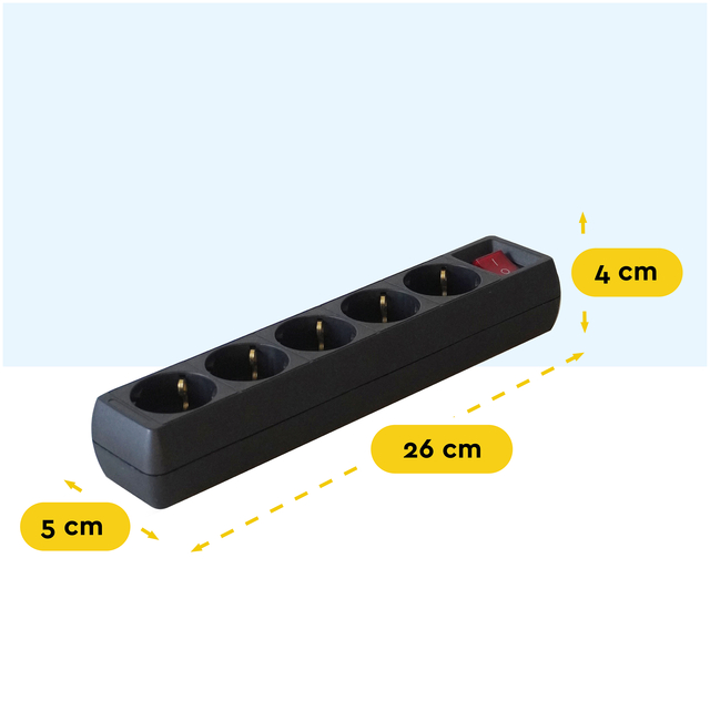 * Nooit meer een stopcontact te kort! Deze BRASQ Stekkerdoos, in zwarte kunststof uitvoering, met 5 stopcontacten is een echte handige must-have en een onmisbaar hulpmiddel in het moderne huishouden en op kantoren. Sluit al je elektrische apparaten aan, zoals tv's, huishoudelijke apparaten, gadgets en (spel)computers aan op deze 5-voudige stekkerdoos met schakelaar. * De stekkerdoos met 5 sockets, die geschikt is voor binnenshuis gebruik, is voorzien van geaarde stopcontacten en een hoofdstekker met PEN-aarde. Hij heeft een compacte afmeting van 26x5x4 cm en biedt dus een oplossing voor de meest krappe ruimtes. De stekkerdoos is direct klaar om te gebruiken en geschikt voor geaarde en niet-geaarde apparaten. * Met zijn handige aan-uit schakelaar kun je gemakkelijk de toevoer van elektriciteit regelen, waardoor je zelf ook het energieverbruik in huis of kantoor bepaald. De schakelaar is uitgerust met verlichting, zodat je ook in het donker duidelijk kunt zien of de schakelaar is ingeschakeld of niet. De verdeeldoos heeft een kabellengte van 5 meter en een zwarte kunststof behuizing. Door de handige schuine plaatsing van de stopcontacten kunnen er makkelijker haakse stekkers op worden aangesloten. * De veiligheids- en aandachtspunten op een rij: *