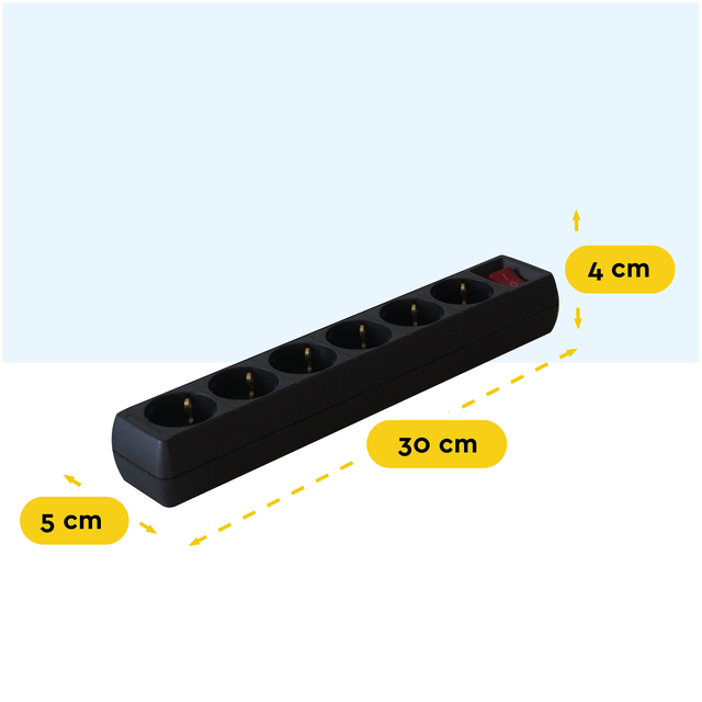 * Nooit meer een stopcontact te kort! Deze BRASQ Stekkerdoos, in zwarte kunststof uitvoering, met 6 stopcontacten is een echte handige must-have en een onmisbaar hulpmiddel in het moderne huishouden en op kantoren. Sluit al je elektrische apparaten aan, zoals tv's, huishoudelijke apparaten, gadgets en (spel)computers aan op deze 6-voudige stekkerdoos met schakelaar. * De stekkerdoos met 6 sockets, die geschikt is voor binnenshuis gebruik, is voorzien van geaarde stopcontacten en een hoofdstekker met PEN-aarde. Hij heeft een compacte afmeting van 30x5x4cm en biedt dus een oplossing voor de meest krappe ruimtes. De stekkerdoos is direct klaar om te gebruiken en geschikt voor geaarde en niet-geaarde apparaten. * Met zijn handige aan-uit schakelaar kun je gemakkelijk de toevoer van elektriciteit regelen, waardoor je zelf ook het energieverbruik in huis of kantoor bepaald. De schakelaar is uitgerust met verlichting, zodat je ook in het donker duidelijk kunt zien of de schakelaar is ingeschakeld of niet. De verdeeldoos heeft een kabellengte van 5 meter en een zwarte kunststof behuizing. Door de handige schuine plaatsing van de stopcontacten kunnen er makkelijker haakse stekkers op worden aangesloten. * De veiligheids- en aandachtspunten op een rij: *
