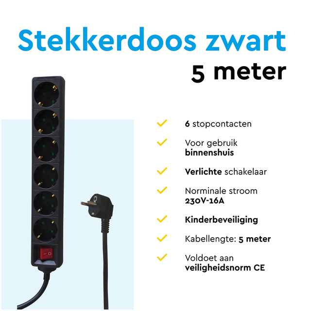 De stekkerdoos met schakelaar voldoet aan alle veiligheidseisen die betrekking hebben op dit product. Hij is voorzien van een ROHS, TUV GS en CE certificaat. * De contactpunten zijn voorzien van kinderbeveiliging. Door het gepatenteerde systeem is het niet mogelijk om voorwerpen in de stopcontacten te steken. * Overbelasting van een stekkerdoos kan leiden tot oververhitting en zelfs brandgevaar. Daarom is het cruciaal om te weten wat het maximale vermogen is dat de stekkerdoos aankan en deze limiet niet te overschrijden. * De zekering of overspanningsbeveiliging die de aangesloten apparaten beschermt tegen piekspanningen en kortsluitingen. * Bovendien is het belangrijk om stekkerdozen regelmatig te controleren op tekenen van slijtage, beschadiging of loszittende onderdelen. * Specificaties: * Capaciteit: 5 stekkers * Voeding: Netstroom