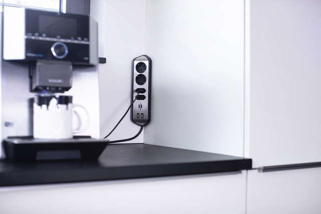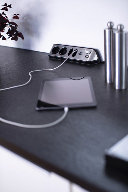 * De compacte brennenstuhl®estilo, met randaarde, hoekstopcontact van zeer breukvast kunststof en hoogwaardig roestvrij stalen oppervlak brengt orde in uw huis. * De universeel bruikbare contactdoosstrook kan eenvoudig worden bevestigd als stekkerdoos voor uw werkblad of als tafelcontactdoosstrook voor uw werkplek met behulp van speciale zelfklevende pads. * De keuken- of tafelcontactdoosstrook kan horizontaal of verticaal worden gemonteerd. * Kabellengte 2 meter. * Kabelaanduiding: H05VV-F 3G1.5. * Met hogere contactbescharming. * 2 contactdozen in 45°-opstelling. * 2 Euro stopcontacten in 90° opstelling. * 2 USB-Lader. * Dit product is niet geschikt voor de Belgische markt.