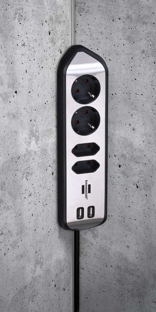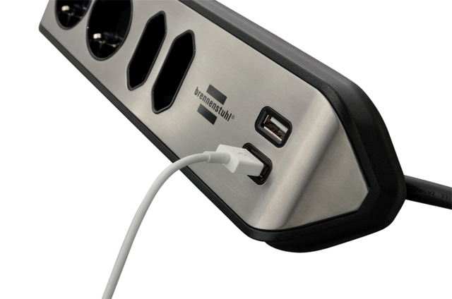 Eigenschappen "Stekkerdoos Brennenstuhl bureau Estilo 4 voudig inclusief 2 USB 2 meter zwart/zilver"