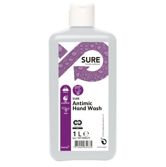 SURE Antimic Hand Wash maakt deel uit van een uniek assortiment plantaardige volledig biologisch afbreekbare* professionele producten voor alle dagelijkse schoonmaak- en persoonlijke verzorgingsbehoeften. SURE Antimic Hand Wash is een kleurstofvrije handdesinfecterende zeep die voedselveilige geur-neutraliserende ingredienten bevat speciaal ontworpen om geuren die geassocieerd worden met voedsel effectief te neutraliseren en te verwijderen zonder de voedselveiligheid in gevaar te brengen. De formule zorgt ervoor dat de hoogste desinfectienormen worden bereikt terwijl de bewezen mildheid voor de huid het een geweldig product maakt voor gebruik in ruimtes waar voedsel wordt bereid en overal waar hygiene een must is. SURE Antimic Hand Wash is volledig biologisch afbreekbaar* en bevat geen gevaarsymbolen. Behalve dat het een milde handzeep is desinfecteert SURE Antimic Handwash ook de handen met een bacteriedodende gistdodende en viruciderende werking raadpleeg de effectiviteitstabel ter referentie.