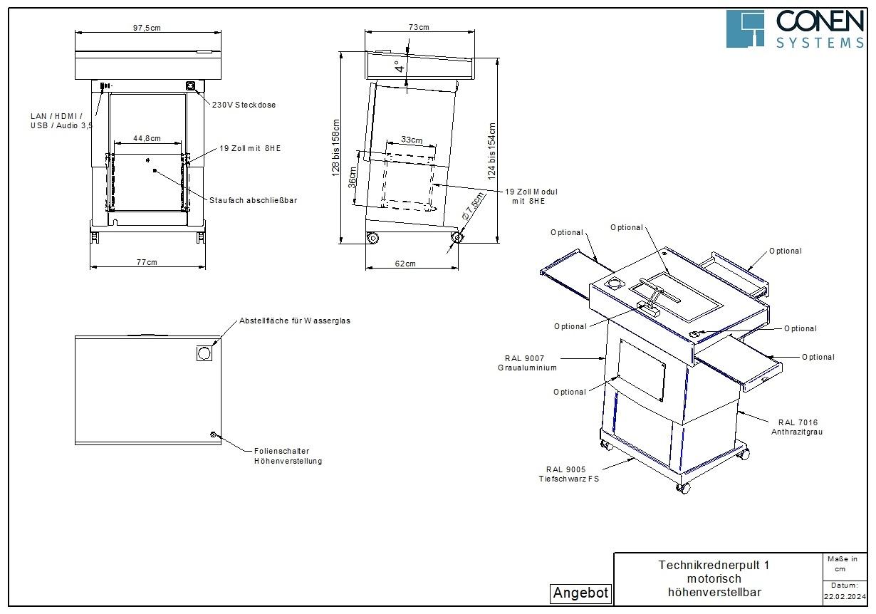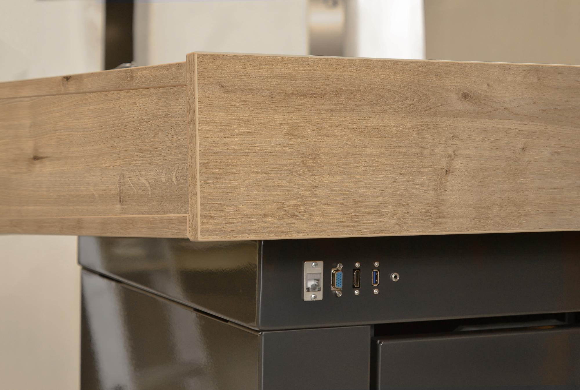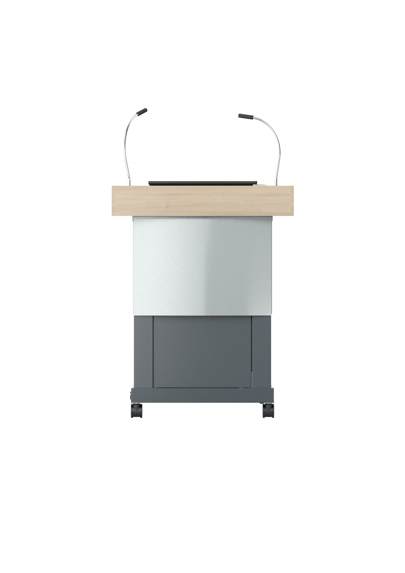 De elegante en elektrisch in hoogte verstelbare katheder is de ideale oplossing voor de inrichting van technische hogescholen, universiteiten en overal waar lezingen en presentaties belangrijk zijn. Om de technische lessenaar 1 ergonomisch aan te kunnen passen aan de grootte van elke spreker, is een traploze, elektrische hoogteverstelling van 30 cm geïntegreerd. Dit geeft de speaker zoveel mogelijk comfort. Naast mobiliteit biedt de elektrisch in hoogte verstelbare katheder vele extra opties en optionele uitsparingen voor de integratie van multimediatechniek. Het technisch spreekgestoelte 1 is voorzien van 4 lichtlopende zwenkwielen, waarvan er 2 kunnen worden vastgezet, zodat het altijd onderweg kan worden gebruikt. Op verzoek kunnen we het bureau ook voorzien van verstelbare poten. Voor het huisvesten van 19" techniek (max. 8U) heeft het katheder een afsluitbare onderkast waarin diverse technische apparaten kunnen worden ondergebracht. Tot de basisuitrusting behoren een opbergvak voor een waterglas en een aansluitpaneel (HDMI, USB/LAN, 3,5 jack stereo en 230V stopcontact) in het midden onder de lessenaarbevestiging, dat ca. 8° ten opzichte van de spreker helt.