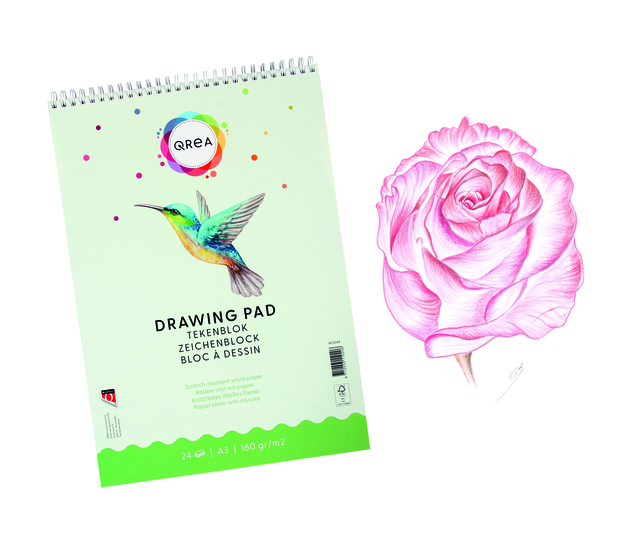 * Of je nu een beginner bent of een professionele kunstenaar, dit tekenblok van Qrea is geschikt voor iedereen! * Met dit tekenblok van 160 grams papier maak je de mooiste tekeningen of schetsen. * Dit schetsblok heeft een dubbele spiraal. * Het bevat radeervast papier. * Het harde karton aan de onderkant zorgt voor optimaal gebruiksgemak. * Afmeting: A3 formaat. * Blok à 24 vellen papier. * Diverse formaten beschikbaar. * Geproduceerd in Nederland.