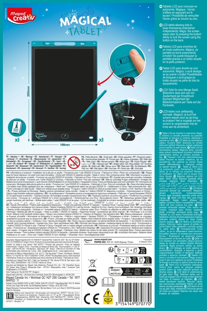 * Magisch tekentablet met LCD-scherm XL. Teken of schrijf naar hartenlust, druk op het toverstokje en alles verdwijnt! Handige tip: Je kunt de meegeleverde pen van de tablet met een touwtje vastmaken (niet inbegrepen). * Er wordt 1 knoopcelbatterij type CR2016 3V meegeleverd. Handig om mee te nemen op reis, naar familie of het restaurant. Het tablet is bovendien geluidloos. * Formaat: 12 inch.. * Geschikt voor kinderen vanaf 4 jaar.