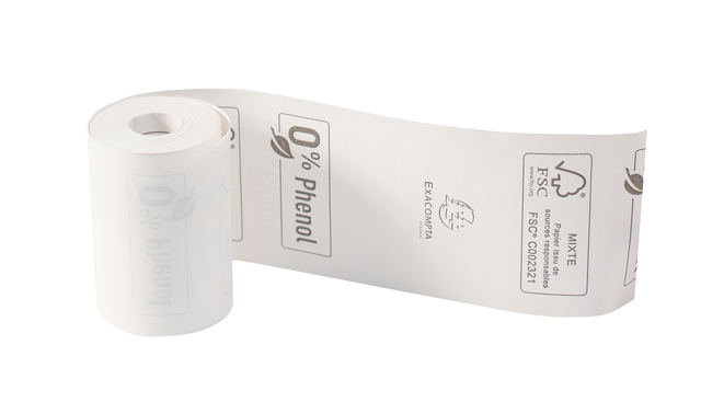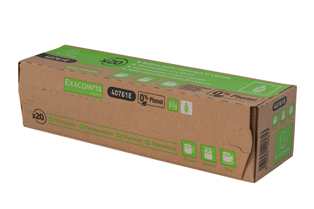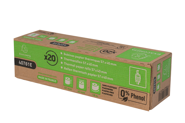 * Rol voor bankterminaltickets. * 1 laag thermisch papier 55g/m2 fenol- en plasticvrij. * Afmetingen van de rol: breedte 57mm, diameter 40mm, lengte (+/- 2m) 18m. * Geschikt voor alle types van bankterminals. * Gegarandeerd fenolvrij papier, dwz zonder bisfenol A, maar ook zonder bisfenol S. * De achterkant van het papier is bedrukt en vermeldt 0% fenol, het FSC® logo en het Exacompta logo. * Rol zonder kern en zonder plastic folie met als doel afval zoveel mogelijk te beperken en toch dezelfde efficiëntie te behouden. * Verpakt in een hersluitbare kartonnen doos voor een betere bescherming tegen licht en vochtigheid, waardoor de rollen vóór gebruik onder optimale omstandigheden kunnen worden bewaard. * Zeer gevoelig papier dat een goede leesbaarheid van de afdruk garandeert. * Waarschuwing einde rol. * Geproduceerd in Frankrijk. * Doos met 20 rollen - karton van 6 dozen.