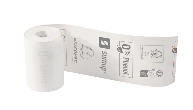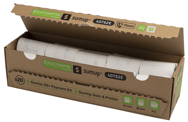 * Rol voor betaalbewijs bankkaart SumUp. * 1 laag thermisch papier 55g/m2 fenol- en plasticvrij. * Afmetingen rol: breedte 57mm, diameter 30mm, lengte (+/- 2m) 9m. * Speciaal ontworpen voor SumUp terminals met printer (SumUp 3G+ Betalingskit / SumUp Solo & printer). * Gegarandeerd fenolvrij papier, dwz zonder bisfenol A en zonder bisfenol S. * Met vermelding van 0% fenol, FSC® logo en Exacompta logo op de achterkant van het papier. * Zonder centrale kern en zonder plastic film om afval zoveel mogelijk te beperken en toch dezelfde efficiëntie te behouden.* Verpakt in een hersluitbare kartonnen doos voor een betere bescherming tegen licht en vocht. Hierdoor worden de rollen in betere omstandigheden bewaard voor gebruik. * Zeer gevoelig papier dat een goede leesbaarheid van de afdruk garandeert. * Voorzien van einde rol waarschuwing. * Gemaakt in Frankrijk. * Doos met 20 rollen - omverpakking per 6 dozen.