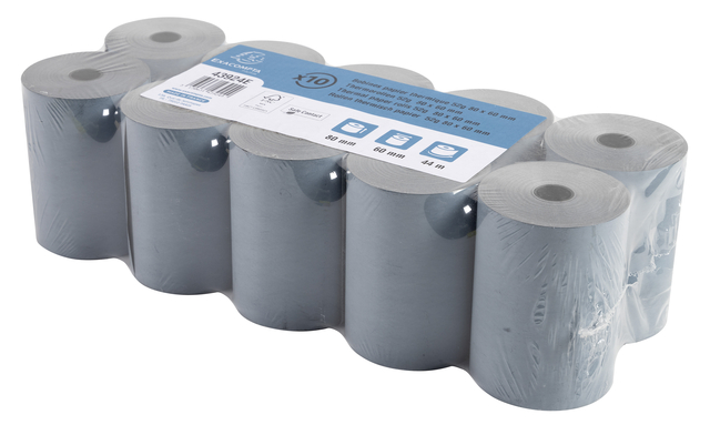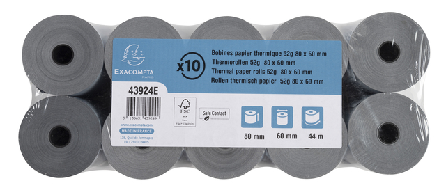 * Telrol voor weegschaal. * 1 laag thermisch papier 52g/m2 - Safe Contact. * Afmetingen rol: breedte 80mm, diameter 60mm, lengte (+/- 2m) 44m. * Standaard asgat van 12mm. * Gepatenteerde innovatie: het bedrukken gebeurt door een fysische reactie, niet door een chemische reactie zoals bij standaard thermisch papier. * Safe Contact rollen bevatten geen chemische ontwikkelaars, bisfenol A of andere fenolen, en zijn dus veilig voor de gezondheid en goedgekeurd voor direct contact met voedsel. * De rollen zijn gemaakt van een licht blauwachtig papier dat niet wordt aangetast door warmte, licht of vochtigheid. Dat zorgt voor een duurzame afdruk: de teksten op het ticket blijven ten minste 35 jaar leesbaar. * Eco-verantwoord papier, FSC® gecertificeerd. * Kan gerecycled worden met papierafval. * Frans fabrikaat.