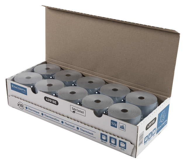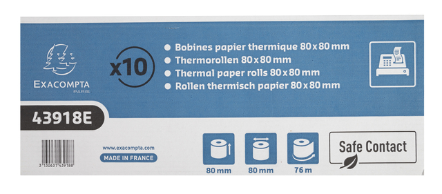 * Telrol voor kassa. * 1 laag thermisch papier 52g/m2 - Safe Contact. * Afmetingen van de rol: breedte 80mm, diameter 80mm, lengte (+/- 2m) 76m. * Standaard asgat van 12mm. * Gepatenteerde innovatie: het bedrukken gebeurt door een fysische reactie, niet door een chemische reactie zoals bij standaard thermisch papier. * Safe Contact rollen bevatten geen chemische ontwikkelaars, bisfenol A of andere fenolen, en zijn dus veilig voor de gezondheid en goedgekeurd voor direct contact met voedsel. * De rollen zijn gemaakt van een licht blauwachtig papier dat niet wordt aangetast door warmte, licht of vochtigheid. Dat zorgt voor een duurzame afdruk: de teksten op het ticket blijven ten minste 35 jaar leesbaar. * Eco-verantwoord papier, FSC® gecertificeerd. * Kan gerecycled worden met papierafval. * Frans fabrikaat. * Verpakt in een hersluitbare doos voor een betere bescherming en bewaring.