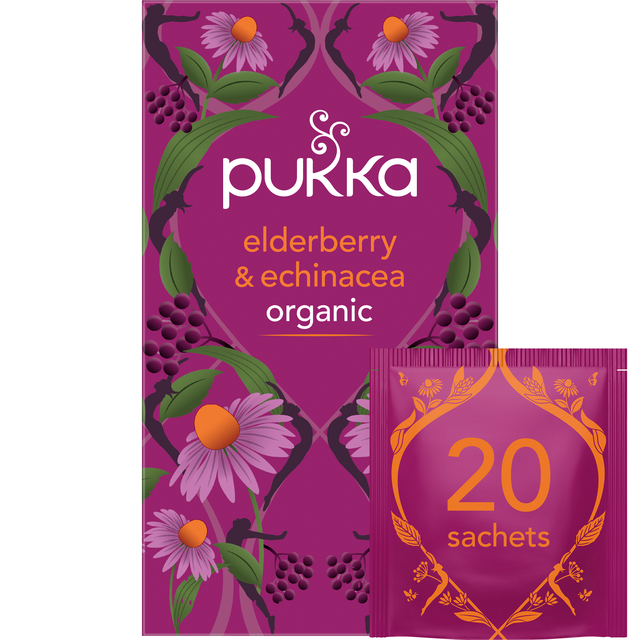 * Pukka Elderberry & Echinacea is een blend met echinacea wortel, blad en vlierbloesem. Gemaakt van 100% biologische ingrediënten die duurzaam verbouwd zijn. * Breng deze heerlijke kruiden tot leven door ze tot 15 minuten in vers gekookt water te laten trekken. * Een doosje bevat 20 individueel verpakte theezakjes die volledig biologisch afbreekbaar zijn.
