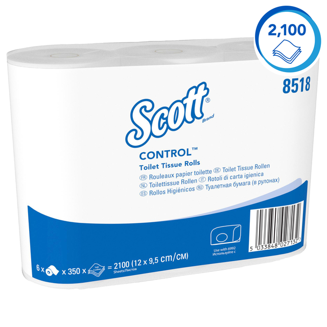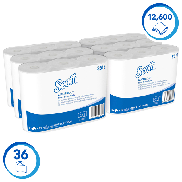 * Scott Control, 8518, Standaardrol Toilettissue, 3-laags, wit, 36 rollen x 350 vellen * Voor betrouwbaarheid in drukke toiletruimten die consistentie, kwaliteit en waarde van een van de meest betrouwbare merken ter wereld vereisen, kiest u Scott® Control™ Toilettissue. Een hoogwaardige 3-laags standaardrol toilettissue die voor efficiënte toiletruimten zorgt. Scott® Control™ Standaardrol Toilettissue is de ideale oplossing voor plaatsen waar de ruimte beperkt is. * Compatibel met Aquarius™ Dubbel Rol Toilettissue Dispensers in wit en zwart (productcodes 6992 en 7191) en past op de meeste standaard Toilettissue Dispensers voor rollen met kern. * Voor milieuzekerheid is Scott® Control™ Standaardrol Toilettissue gemaakt van 100% gerecyclede vezels, voorzien van het FSC-certificaat en het Europese Ecolabel en is goed doorspoelbaar. * Elke omdoos bevat 36 rollen van 350 3-laags vellen van 12 x 9,5 cm. 36 rollen x 350 witte, 3-laags doeken (12.600 in totaal)
