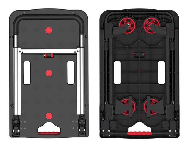 * Praktische lichtgewicht transportwagen welke volledig inklapbaar is tot slechts 9 cm dik. Bij het inklappen van de duwbeugel klappen de wielen automatisch naar binnen toe. Ideaal als je regelmatig goederen moet vervoeren en de transportkar eenvoudig mee wilt kunnen nemen! * Met deze platform trolley verplaats je gemakkelijk meubels, dozen met spullen of wat je ook maar wilt. Met een draagkracht van 137 kilogram is dit je ideale partner voor een snelle verplaatsing van spullen. De opvouwbare en compacte vormgeving zorgen ervoor dat je de transportwagen makkelijk overal mee naartoe kunt nemen, zoals in de achterbak van je auto of verhuisbus. * Het plateau van de platformwagen heeft reliëf waardoor spullen er niet zomaar vanaf glijden. Daarnaast is de transportkar voorzien van een rem, zodat deze altijd netjes op zijn plek blijft staan. * Ook voor menig werkplekomgeving is dit de ideale oplossing om goederen te verplaatsen binnen je organisatie. Zodra je klaar bent, klap je hem in en zet je hem eenvoudig weg dankzij zijn ruimtebesparende eigenschappen. * Afmeting: 705x430x90mm ( ingeklapt) * Gewicht: 5,5Kg