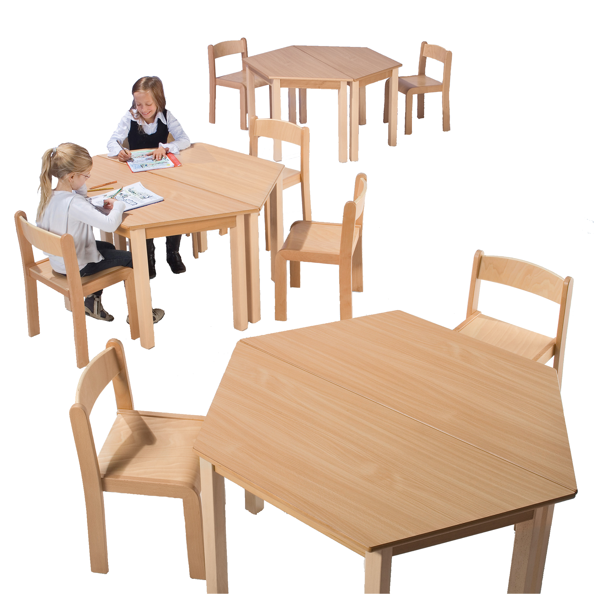 De poten en het frame van deze tafels zijn gemaakt van massief beukenhout. De tafelbladen zijn 19 mm dik en aan beide zijden gelamineerd, de rand bestaat uit een tonvormige, afgeronde massief beukenhouten rand. De zeer resistente en slijtvaste coating is ideaal voor gebruik in kleuterscholen. De tafelpoten worden met dubbele verbindingsbouten stevig in de hoek van het onderstel getrokken. Samen met de stevig verlijmde meenemers (uit vakwerkconstructie) ontstaat een veilige en zeer stabiele hoekverbinding. De verwisselbare tafelpoten hebben nog een voordeel: de tafel kan met je meegroeien. Bestel dan eenvoudig hogere tafelpoten. Beschikbare opties Vilten glijders "F" Gefreesde tafelonderstellen "A" 2 wielen in een set "TFR"