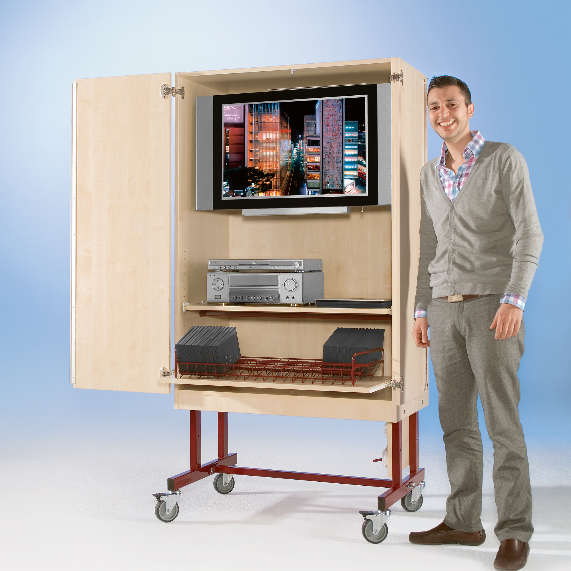 De tweedeurs tv-trolley biedt opbergruimte voor lcd-, plasma- of led-televisies tot 90 cm breed. Een plank creëert extra opbergruimte voor een dvd-speler of iets dergelijks.De planken in onze kasten zijn voorzien van een uittrekbeveiliging die voorkomt dat ze per ongeluk worden uitgetrokken. Rechts en links van het stalen buitenframe bevindt zich een gelaste handgreep, waarmee u de kast gemakkelijk kunt trekken. Vier zware, lichtlopende zwenkwielen, waarvan er twee vergrendelbaar zijn, zorgen ervoor dat de tv-trolley mobiel is. Onze kasten zijn gemaakt van 19 mm dikke, hoogwaardige E1 fijnspaanplaat, de zijwanden liggen op de vloer. Alle verbindingen zijn met pluggen en verlijmd en hebben bij hoge kasten ook verbindingsbeslag. Dit ontwerp zorgt voor een enorme stabiliteit en stabiliteit. ABS-kanten met een dikte van 2 mm beschermen de karkasranden tegen vocht en stoten en verlengen zo de levensduur van de kasten. Dankzij de ingebedde 8 mm zichtbare achterwand bent u vrij om de kast te plaatsen - of het nu tegen de muur is of vrij in de kamer. Het corpusoppervlak is afgewerkt met een hoogwaardige melamineharscoating en is verkrijgbaar in veel verschillende decors. Het kan met een vochtige doek worden afgeveegd en is probleemloos bestand tegen het dagelijkse schoolleven.