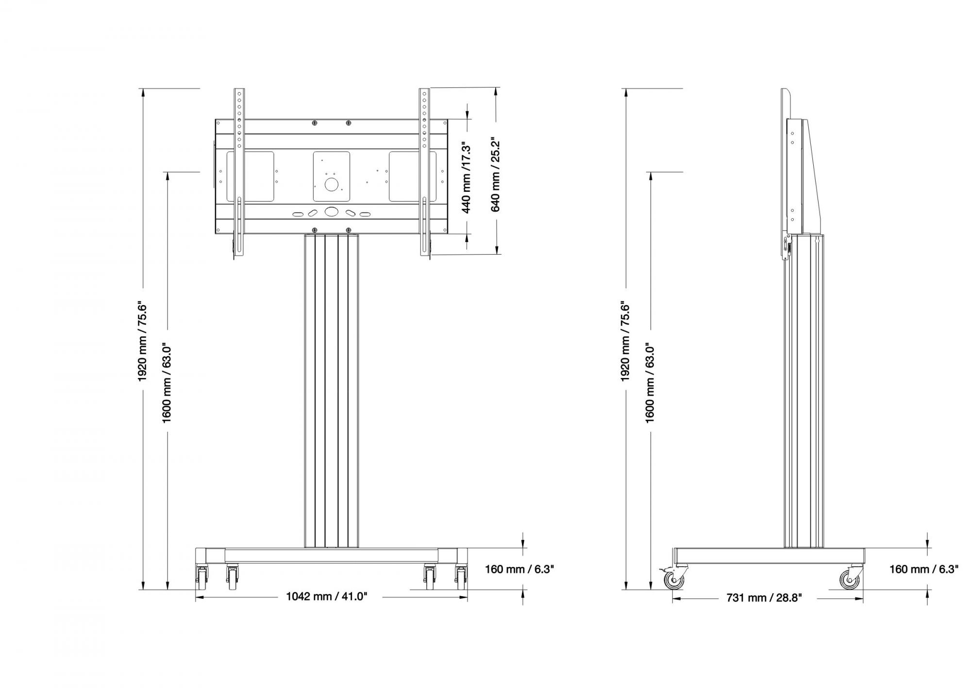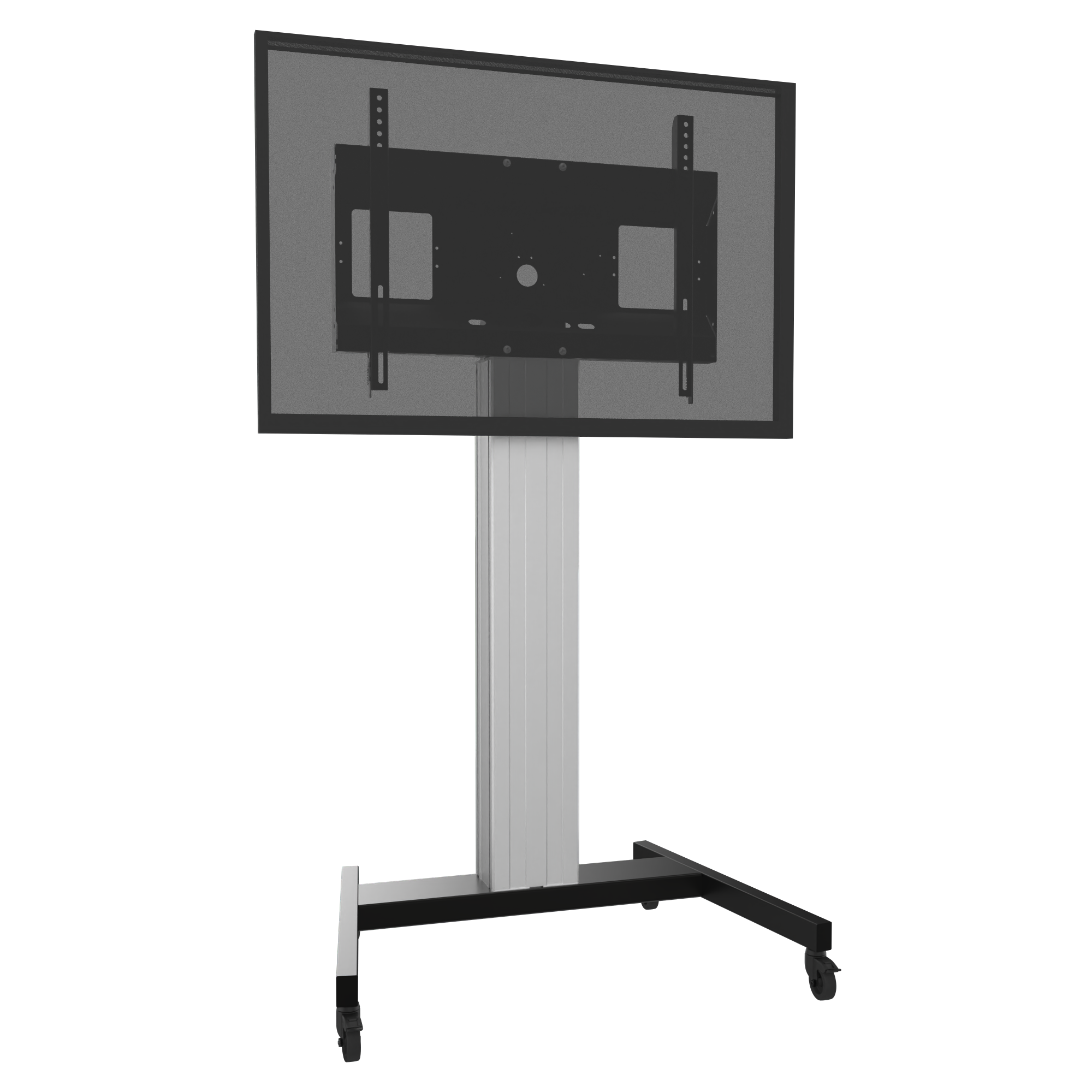 Tv-trolley voor touchscreen monitoren met een diagonaal van 42"-100". Voor toepassingen waarbij niet per se een hoogteverstelling nodig is, biedt Conen Mounts een reeks niet in hoogte verstelbare tv-trolleys. De rolstaanders zijn voorzien van een centrale aluminium kolom van verschillende hoogtes. De beeldschermbevestiging wordt boven de middenkolom gemonteerd. Dit biedt de mogelijkheid om de kabels achter het display op te bergen. De mobiele monitorbeugel is voorzien van het V-vormige rolframe. Het V-frame wordt geleverd in zwart, met vier met rubber beklede lichtlopende wielen, waarvan twee met parkeerrem. Het systeem wordt gedemonteerd geleverd in drie verpakkingseenheden. Verzenden kan per pakketdienst.