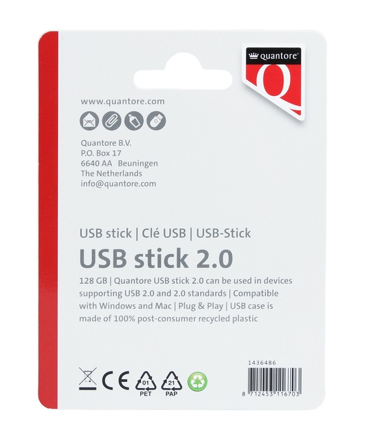 Sla je bestanden eenvoudig op met de USB-stick van Quantore. Met 128GB opslagcapaciteit en USB 2.0-technologie is deze stick perfect voor het dagelijks gebruik van documenten, foto's en video's. De compacte, lichtgewicht behuizing is gemaakt van 100% gerecycled plastic en voorzien van een beschermkapje voor extra bescherming. Dankzij Plug & Play is de USB-stick direct klaar voor gebruik op zowel Windows- als Mac-apparaten. Kenmerken: * Type: USB-stick 2.0. * Opslagcapaciteit: 128GB. * Kleur: zwart. * Compatibiliteit: Windows en Mac. * Aansluiting: USB 2.0. * Leessnelheid: max. 30 MB/s, min. 18 MB/s. * Schrijfsnelheid: max. 10 MB/s, min. 7 MB/s. * Extra: voorzien van beschermkapje. * Duurzaamheid: behuizing gemaakt van 100% gerecycled plastic.