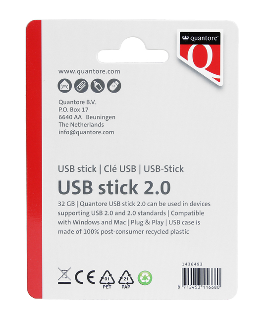 Sla je bestanden eenvoudig op en wissel ze snel uit met de USB-stick van Quantore. Met 32GB opslagcapaciteit en USB 2.0-technologie is deze stick ideaal voor het opslaan van documenten, foto's en video's. De compacte, lichtgewicht behuizing is gemaakt van 100% gerecycled plastic en voorzien van een beschermkapje voor extra duurzaamheid. Dankzij Plug & Play is de USB-stick direct klaar voor gebruik op zowel Windows- als Mac-apparaten. Kenmerken: * Type: USB-stick 2.0. * Opslagcapaciteit: 32GB. * Kleur: zwart. * Compatibiliteit: Windows en Mac. * Aansluiting: USB 2.0. * Leessnelheid: max. 30 MB/s, min. 18 MB/s. * Schrijfsnelheid: max. 10 MB/s, min. 7 MB/s. * Extra: voorzien van beschermkapje. * Duurzaamheid: behuizing gemaakt van 100% gerecycled plastic.