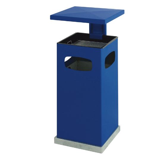 Stalen as-papierbak met afneembaar afdak en drie inworpopeningen. Voorzien van verzinkte binnenemmer zwarte inzetbak en verchroomde zeef. Inclusief bevestigingsmateriaal voor vloermontage. Afmetingen: Afmetingen binnenvoering: 300x300x435mm LxBxH Formaat: B 395 mm L 395 mm H 910 mm