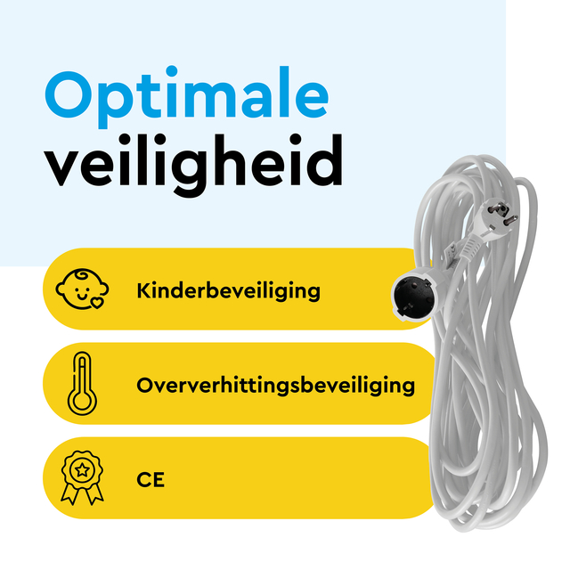 Gebruik in droge omgevingen: bewaar de verlengkabel op een droge, goed geventileerde plek om kortsluiting en andere gevaren te vermijden. * Met de BRASQ Verlengkabel 20 Meter heb je een veilige en praktische verlengoplossing die zorgt voor extra bereik. Bestel nu en ervaar het gemak van flexibele stroomvoorziening voor al je apparaten, zowel thuis als op kantoor! * Specificaties: * Materiaal: Rubber * Kleur: Oranje * Kabellengte: 20 meter * Voeding: Netstroom * Hoofdstekker: Randaarde * Stopcontact: Schuko Type F (randaarde) * Max. Belasting opgerold: 3500W Nominale stroom: 250V Max. Ampere: 16A * Draaddikte: 1,5mm * Beveiliging: Kinderbeveiliging * Keurmerken: ROHS, GS en CE certificaat