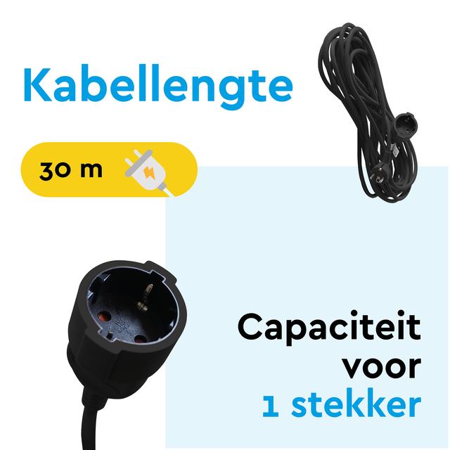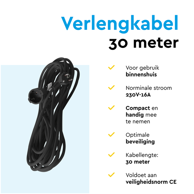 * Overal stroom, binnen handbereik! Binnen het BRASQ verlengsnoeren assortiment is er voor elk tekort van een contactpunt - of te korte stroomkabels - een gepaste oplossing. Plug-and-play, zonder ingewikkelde installaties. * De BRASQ Verlengkabel is ontworpen om aan al je stroombehoeften te voldoen. Met deze verlengkabel krijg je extra bewegingsvrijheid voor je apparaten. Plaats je lamp, oplader of ander elektronisch apparaat waar je maar wilt. * Het gebruik van de verlengkabel is praktisch en functioneel, en de universele stekker past op de meeste stopcontacten, waardoor het een veelzijdige keuze is. De BRASQ Verlengkabel is geschikt voor diverse toepassingen, zoals verlichting, huishoudelijke apparaten en kantoorapparatuur. * De BRASQ Verlengkabel heeft een lengte van 30 meter, waardoor je een groot bereik hebt. De BRASQ Kabelhaspel worden vervaardigd met hoogwaardige materialen die bestand zijn tegen slijtage en zorgen voor een veilige omgeving. * Veiligheids- en Gebruikstips: * Regelmatige controle: inspecteer de kabel regelmatig op slijtage of beschadigingen om optimale veiligheid te waarborgen. Voorkom overbelasting: let op de maximale belasting van 3500W om oververhitting en schade te voorkomen. Gebruik in droge omgevingen: bewaar de verlengkabel op een droge, goed geventileerde plek om kortsluiting en andere gevaren te vermijden. * Met de BRASQ Verlengkabel 30 meter heb je een veilige en praktische verlengoplossing die zorgt voor extra bereik. Bestel nu en ervaar het gemak van flexibele stroomvoorziening voor al je apparaten, zowel thuis als op kantoor! * Specificaties: * Materiaal: Rubber * Kleur: zwart * Kabellengte: 30 meter * Voeding: Netstroom * Hoofdstekker: Randaarde * Stopcontact: Schuko Type F (randaarde) * Max. Belasting opgerold: 3500W Nominale stroom: 250V Max. Ampere: 16A * Draaddikte: 1,5mm * Beveiliging: Kinderbeveiliging * Keurmerken: ROHS, GS en CE certificaat
