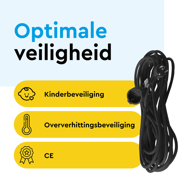 * Overal stroom, binnen handbereik! Binnen het BRASQ verlengsnoeren assortiment is er voor elk tekort van een contactpunt - of te korte stroomkabels - een gepaste oplossing. Plug-and-play, zonder ingewikkelde installaties. * De BRASQ Verlengkabel is ontworpen om aan al je stroombehoeften te voldoen. Met deze verlengkabel krijg je extra bewegingsvrijheid voor je apparaten. Plaats je lamp, oplader of ander elektronisch apparaat waar je maar wilt. * Het gebruik van de verlengkabel is praktisch en functioneel, en de universele stekker past op de meeste stopcontacten, waardoor het een veelzijdige keuze is. De BRASQ Verlengkabel is geschikt voor diverse toepassingen, zoals verlichting, huishoudelijke apparaten en kantoorapparatuur. * De BRASQ Verlengkabel heeft een lengte van 20 meter, waardoor je een groot bereik hebt. De BRASQ Kabelhaspel worden vervaardigd met hoogwaardige materialen die bestand zijn tegen slijtage en zorgen voor een veilige omgeving. * Veiligheids- en Gebruikstips: * Regelmatige controle: inspecteer de kabel regelmatig op slijtage of beschadigingen om optimale veiligheid te waarborgen. Voorkom overbelasting: let op de maximale belasting van 3500W om oververhitting en schade te voorkomen. Gebruik in droge omgevingen: bewaar de verlengkabel op een droge, goed geventileerde plek om kortsluiting en andere gevaren te vermijden. * Met de BRASQ Verlengkabel 20 Meter heb je een veilige en praktische verlengoplossing die zorgt voor extra bereik. Bestel nu en ervaar het gemak van flexibele stroomvoorziening voor al je apparaten, zowel thuis als op kantoor! * Specificaties: * Materiaal: Rubber * Kleur: zwart * Kabellengte: 20 meter * Voeding: Netstroom * Hoofdstekker: Randaarde * Stopcontact: Schuko Type F (randaarde) * Max. Belasting opgerold: 3500W Nominale stroom: 250V Max. Ampere: 16A * Draaddikte: 1,5mm * Beveiliging: Kinderbeveiliging * Keurmerken: ROHS, GS en CE certificaat